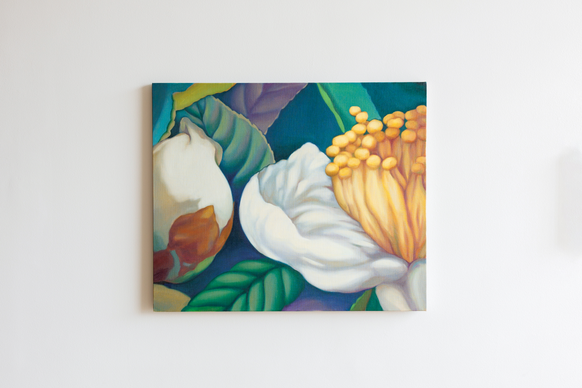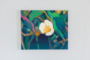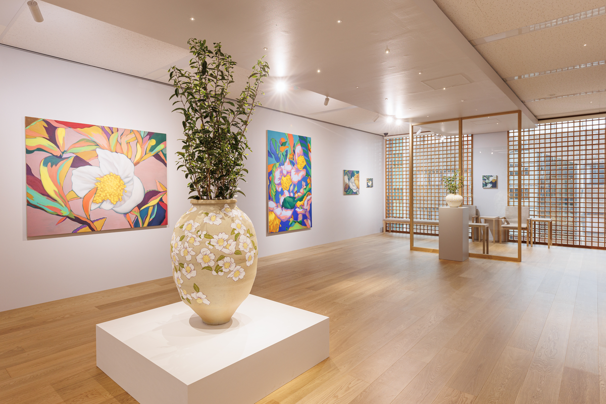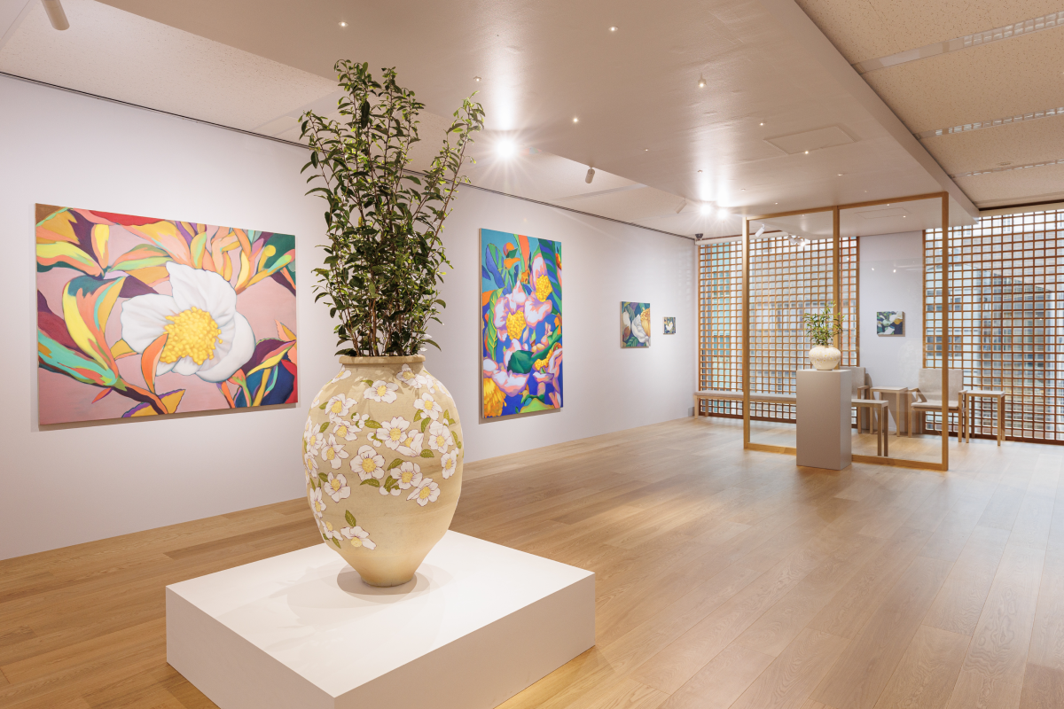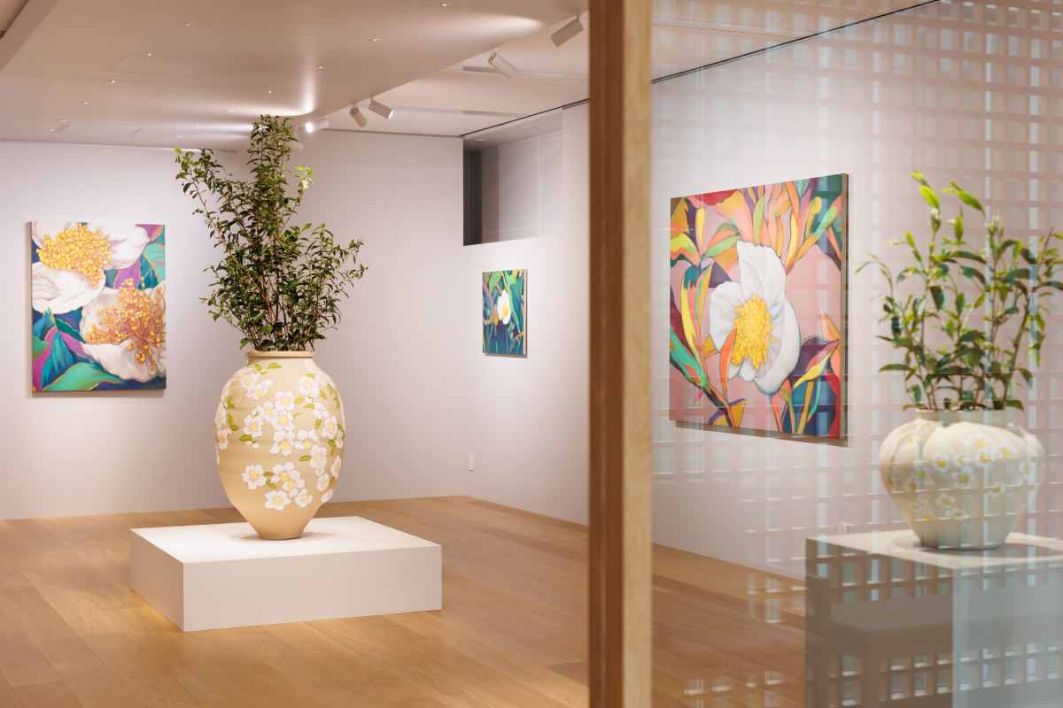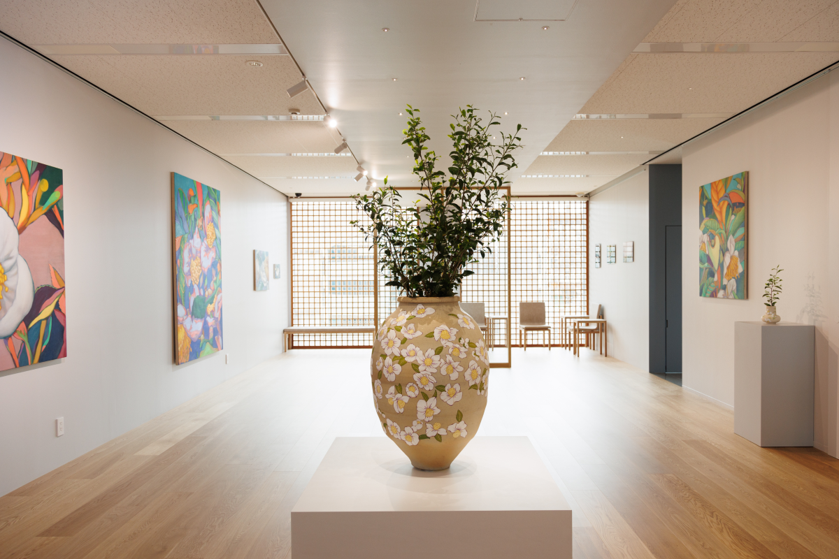 その儚さに醜美を見出し、絵画とインスタレーションでお茶の花を表現しています。