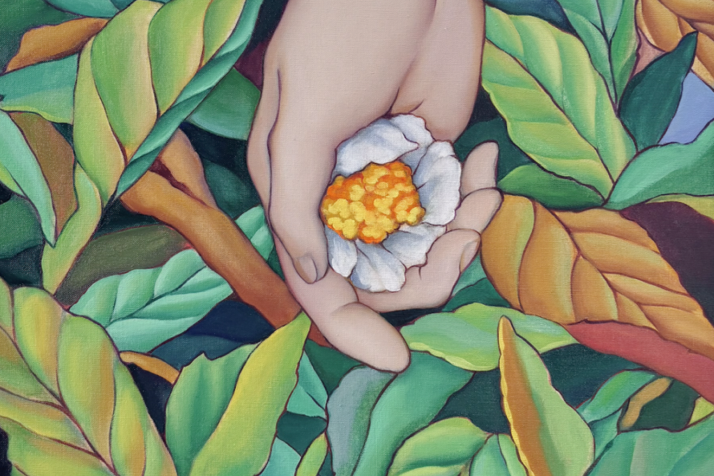 戸田沙也加 / Bloom in Hand(2025) 素材:キャンバス、油彩 サイズ:H84×W53×D2cm